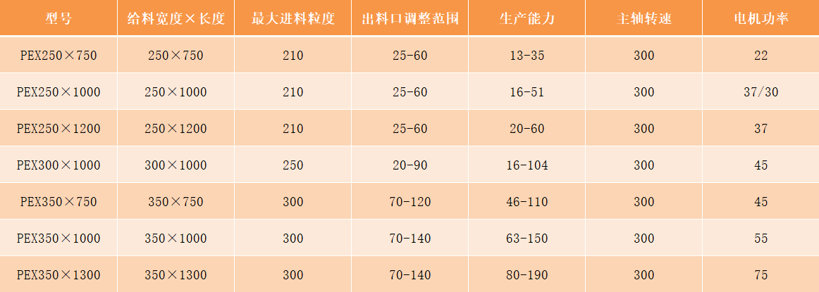 PEX系列細(xì)碎顎式破碎機(jī)型號(hào)及技術(shù)參數(shù):