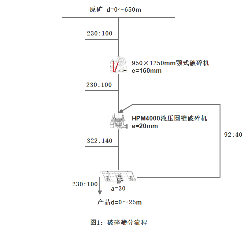 (1)顎式破碎機(jī)的破碎比S1:顎式破碎機(jī)產(chǎn)品最大粒度為d大=200mm,其第一段破碎比為S1=3.25。其破碎比范圍符合3-6的理論要求。