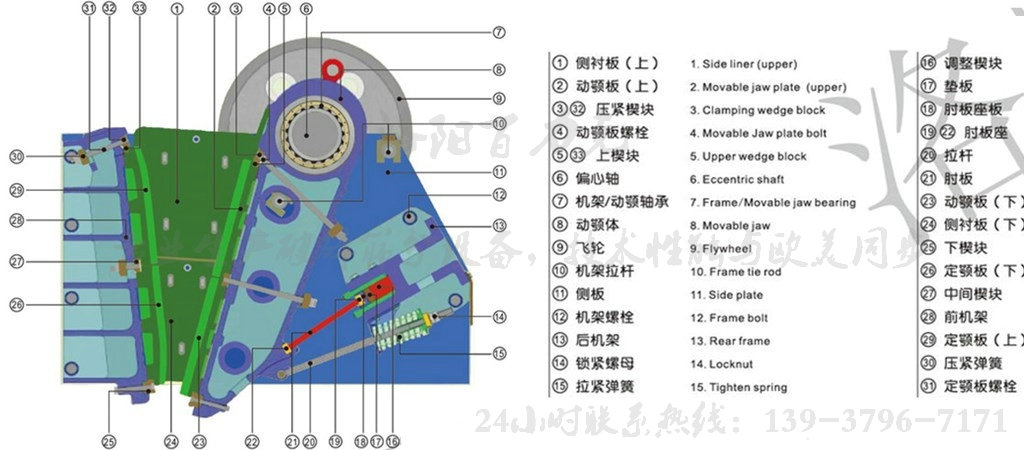顎式破碎機(jī)工作時(shí)電動(dòng)機(jī)驅(qū)動(dòng)皮帶和皮帶輪,通過偏心軸使動(dòng)顎上下運(yùn)動(dòng),當(dāng)動(dòng)顎上升時(shí)肘板和動(dòng)顎間夾角變大,從而推動(dòng)動(dòng)顎板向定顎板靠近,此時(shí)被破碎的物料被擠壓、搓、碾等多重受力而被破碎。當(dāng)動(dòng)顎下行時(shí),肘板和動(dòng)顎間夾角變小,動(dòng)顎板在拉桿、彈簧的作用下與定顎板的間距拉大,此時(shí)被破碎的物料從破碎腔出料口排出,隨著偏心軸的連續(xù)運(yùn)轉(zhuǎn),動(dòng)顎作周期性的往復(fù)運(yùn)動(dòng),進(jìn)入破碎腔的物料不斷地被破碎、排出,實(shí)現(xiàn)連續(xù)生產(chǎn)。