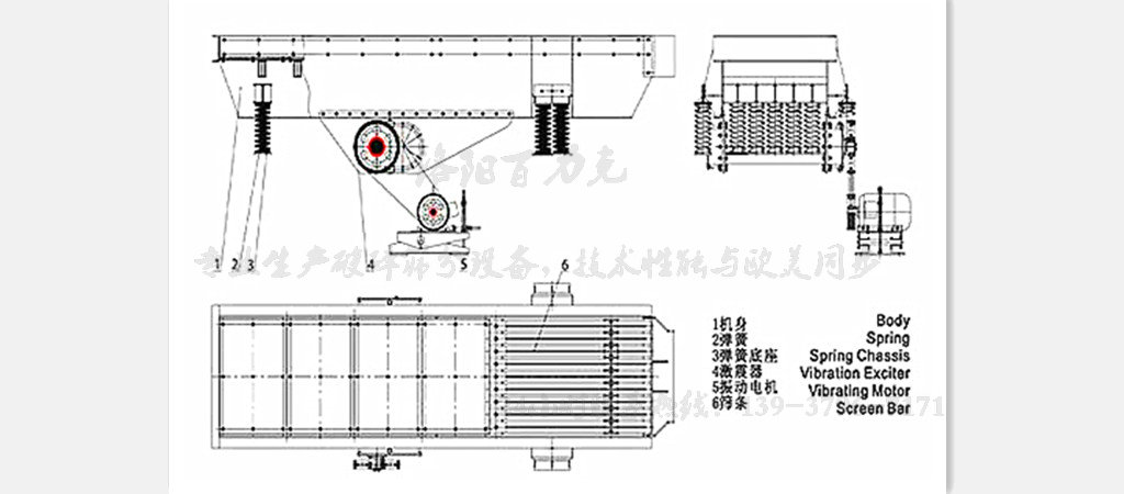2、通常,在棒條振動給料機的排料端裝備有一個柵篩。通過它,分離出粒度小于各柵篩條 間距的物料,并將較大粒度的物料輸送到破碎機內(nèi)。給料機被安裝固定在其基座上,且基座上配備有彈簧,以承載給料機的振動。